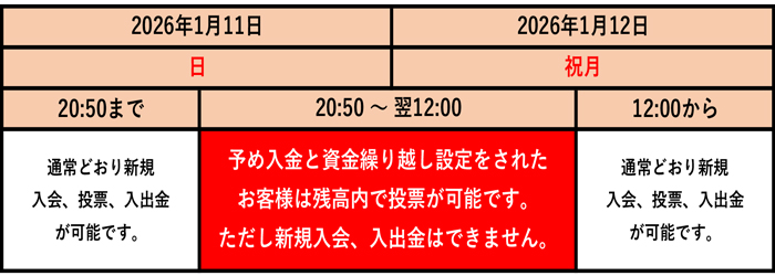・2026年1月12日10時00分から12時00分までの間にご投票されるお客様は、2026年1月11日20時49分までに資金繰り越し設定と入金指示をお願いします。